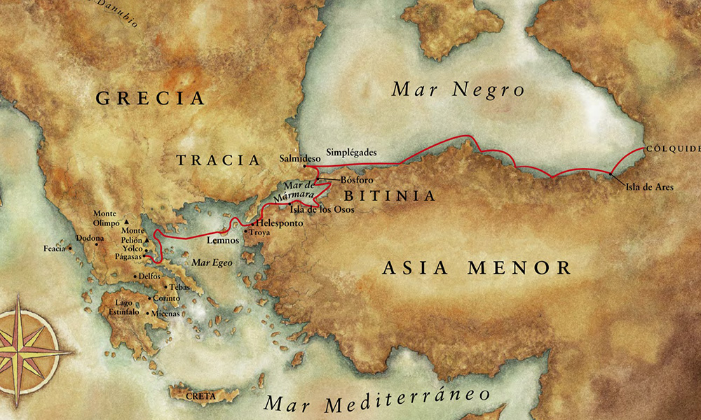 Jasón estaba a punto de embarcarse pues en una misión imposible. El astuto rey Pelias lo había engatusado y lo enviaba a una remota y peligrosa región donde esperaba que en lugar del vellocino encontrara la muerte. El largo viaje, como se puede apreciar en la ilustración, comenzaría en la región griega de Tesalia y terminaría en Colquios, en la orilla oriental del mar Negro, una región que hoy pertenece a Georgia, la patria del monstruoso y no menos mitológico Stalin.