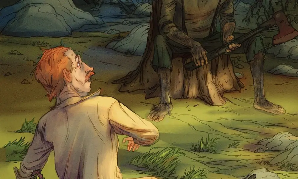 «Tom Walker, empero, no era hombre que se asustara fácilmente con esos relatos. Se echó a reposar contra el tronco de un árbol caído, incluso se deleitó con los trinos de un pájaro, y mientras recuperaba las fuerzas comenzó a apilar barro con su bastón… Así estaba, removiendo el barro sin pensar en lo que hacía, cuando tropezó su bastón con algo que le ofreció dura resistencia; se levantó, removió un poco más de barro y sacó aquello contra lo que había chocado la punta de su bastón; era una calavera que tenía clavado un tomahawk indio. Por el estado del hacha supo que había pasado mucho tiempo desde que se produjera el ataque, así que no le dio más importancia a su descubrimiento, diciéndose que no era más que un triste recuerdo de aquellos días de lucha feroz entre los colonos y los guerreros indios.